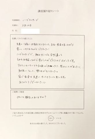 ハンドマッサージで、触れ方一つでも全然違って それを体験しながら学ぶことができたのでよかったです。