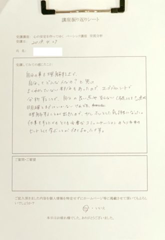自分のことを理解する上で、自分ってどんな人なの?と思ってよくわかっていない部分もあったのでエゴグラムシートを分析することで、自分の良い点や至らない(不足している?)点が明確にとまではいかないけれども理解することが出来たので少しホッとした気持になった。