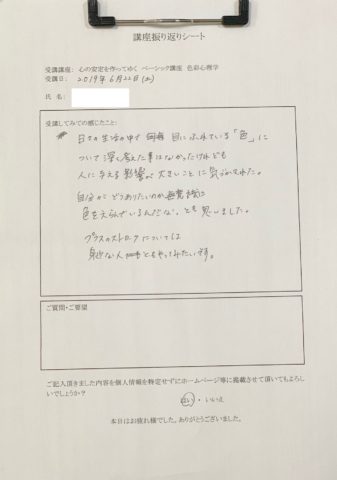 心の安定を作ってゆく ベーシック講座 色彩心理学 講座後感想