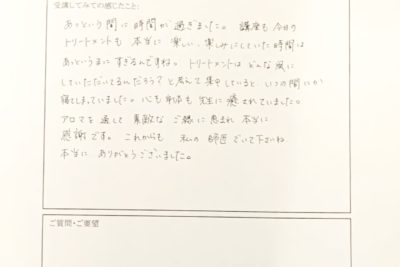 アロマコーディネーター講座 講座後感想 この日は最後の講座 アロマトリートメント90分体験講座です。 講座の初めと最後に受けていただくアロマトリートメントです。 講座後感想 40代 介護職 あっという間に時間が過ぎました。 講座も今日のトリートメントも本当に楽しい、楽しみ...