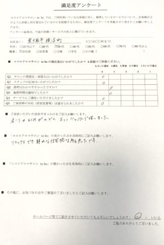●ご来店いただいた症状やきっかけ: 肩こりやむくみがひどくホットペッパーで探しました。 ●「ココロアロマサロン to be」の良かった点: リラックスでき、静かな住宅街な所も良かったです。 ●「ココロアロマサロン to be」の悪かった点: ●その他に、お気づきの点やご要望がございましたらご記入をお願いします。: ●ココロアロマサロン to be の満足度はいかがでしたか? 5段階でご評価ください。5:大いに満足 4:満足 3:普通 2:不満足 1:大いに不満足 Q1:サロンの雰囲気・清潔さはいかがでしたか? 5 Q2:スタッフの応対はいかがでしたか? 5 Q3:説明はわかりやすかったですか? 4 Q4:施術時間は適切でしたか? 4 Q5:サービスにご満足いただけましたか? 5 Q6:ご来店の目的(症状改善等)は達せられましたか? 5