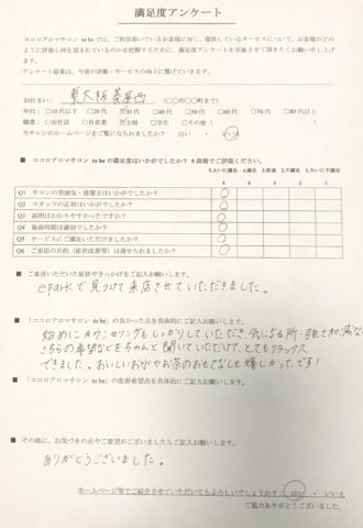 ●ご来店いただいた症状やきっかけ: 症状:むくみ、腰痛、肩こり きっかけ:クーポンサイト ●「ココロアロマサロン to be」の良かった点: 始めにカウセリングもしっかりしていただき、気になる所、強さ加減などこちらの希望をちゃんと聞いていただけて、とてもリラックスできました。おいしいお水やお茶のおもてなしも嬉しかったです! ●「ココロアロマサロン to be」の悪かった点: ●その他に、お気づきの点やご要望がございましたらご記入をお願いします。: ●ココロアロマサロン to be の満足度はいかがでしたか? 5段階でご評価ください。5:大いに満足 4:満足 3:普通 2:不満足 1:大いに不満足 Q1:サロンの雰囲気・清潔さはいかがでしたか? 5 Q2:スタッフの応対はいかがでしたか? 5 Q3:説明はわかりやすかったですか? 5 Q4:施術時間は適切でしたか? 5 Q5:サービスにご満足いただけましたか? 5 Q6:ご来店の目的(症状改善等)は達せられましたか? 5![]()