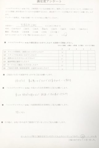 ●ご来店いただいた症状やきっかけ: 体のだるさ 鼻が悪いのでアロマで改善するかも。。。と期待 ●「ココロアロマサロン to be」の良かった点: 香りや施術の強さなど、相談して決めることが出来る点 ●「ココロアロマサロン to be」の悪かった点: 特になし ●その他に、お気づきの点やご要望がございましたらご記入をお願いします。: ●ココロアロマサロン to be の満足度はいかがでしたか? 5段階でご評価ください。5:大いに満足 4:満足 3:普通 2:不満足 1:大いに不満足 Q1:サロンの雰囲気・清潔さはいかがでしたか? 5 Q2:スタッフの応対はいかがでしたか? 5 Q3:説明はわかりやすかったですか? 5 Q4:施術時間は適切でしたか? 5 Q5:サービスにご満足いただけましたか? 5 Q6:ご来店の目的(症状改善等)は達せられましたか? 5![]()