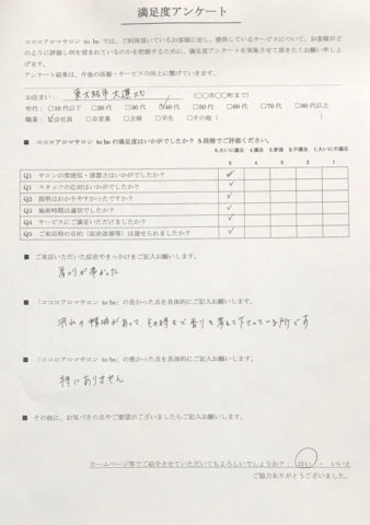 ●ご来店いただいた症状やきっかけ: 肩こりが辛かった。 ●「ココロアロマサロン to be」の良かった点: 沢山の精油があって、その時々で香りを考えて下さっている所です。 ●「ココロアロマサロン to be」の悪かった点: 特にありません。 ●その他に、お気づきの点やご要望がございましたらご記入をお願いします。: ●ココロアロマサロン to be の満足度はいかがでしたか? 5段階でご評価ください。5:大いに満足 4:満足 3:普通 2:不満足 1:大いに不満足 Q1:サロンの雰囲気・清潔さはいかがでしたか? 5 Q2:スタッフの応対はいかがでしたか? 5 Q3:説明はわかりやすかったですか? 5 Q4:施術時間は適切でしたか? 5 Q5:サービスにご満足いただけましたか? 5 Q6:ご来店の目的(症状改善等)は達せられましたか?5