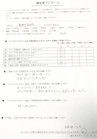 ●ご来店いただいた症状やきっかけ: 背中が張って腰が痛かった。 全身むくんでいる様な感じ ●「ココロアロマサロン to be」の良かった点: ゆっくりしたな と実感できました。 アドバイスも頂いて、自分の身体も もう少し見直そうと思いました。 ●「ココロアロマサロン to be」の悪かった点: 特にありません。 ●その他に、お気づきの点やご要望がございましたらご記入をお願いします。: ●ココロアロマサロン to be の満足度はいかがでしたか? 5段階でご評価ください。5:大いに満足 4:満足 3:普通 2:不満足 1:大いに不満足 Q1:サロンの雰囲気・清潔さはいかがでしたか? 5 Q2:スタッフの応対はいかがでしたか? 5 Q3:説明はわかりやすかったですか? 5 Q4:施術時間は適切でしたか? 5 Q5:サービスにご満足いただけましたか? 5 Q6:ご来店の目的(症状改善等)は達せられましたか? 5![]()