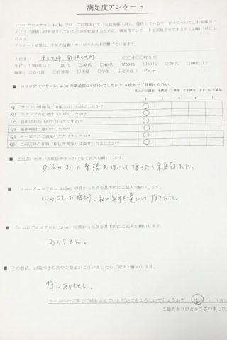 ●ご来店いただいた症状やきっかけ: 身体のコリと緊張をほぐして頂きたく来店致しました。 ●「ココロアロマサロン to be」の良かった点: 心のこもった施術。私の身体を楽にして頂きました。 ●「ココロアロマサロン to be」の悪かった点: ありません。 ●その他に、お気づきの点やご要望がございましたらご記入をお願いします。: 特にありません。 ●ココロアロマサロン to be の満足度はいかがでしたか? 5段階でご評価ください。5:大いに満足 4:満足 3:普通 2:不満足 1:大いに不満足 Q1:サロンの雰囲気・清潔さはいかがでしたか? 5 Q2:スタッフの応対はいかがでしたか? 5 Q3:説明はわかりやすかったですか? 5 Q4:施術時間は適切でしたか? 5 Q5:サービスにご満足いただけましたか? 5 Q6:ご来店の目的(症状改善等)は達せられましたか? 5![]()