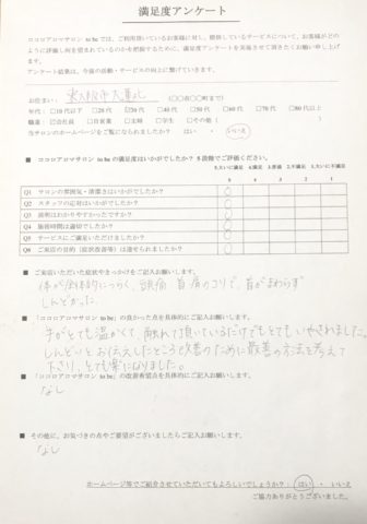 ●ご来店いただいた症状やきっかけ: 症状:体が全体的につらく、頭痛、首、肩のコリで首がまわらずしんどかった ●「ココロアロマサロン to be」の良かった点: 手がとても温かくて、触れて頂いているだけでもとてもいやされました。 しんどいとお伝えしたところの改善のため、最善の方法を考えて下さり、とても楽になりました。 ●「ココロアロマサロン to be」の悪かった点: なし ●その他に、お気づきの点やご要望がございましたらご記入をお願いします。: なし ●ココロアロマサロン to be の満足度はいかがでしたか? 5段階でご評価ください。5:大いに満足 4:満足 3:普通 2:不満足 1:大いに不満足 Q1:サロンの雰囲気・清潔さはいかがでしたか? 5 Q2:スタッフの応対はいかがでしたか? 5 Q3:説明はわかりやすかったですか? 5 Q4:施術時間は適切でしたか? 5 Q5:サービスにご満足いただけましたか? 5 Q6:ご来店の目的(症状改善等)は達せられましたか? 5![]()