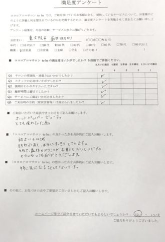 ●ご来店いただいた症状やきっかけ: ホットペッパービューティーを見てご来店。 とても疲れていた為 ●「ココロアロマサロン to be」の良かった点: 程よい加減。 終わったあと、本当にすっきりしています。 それと、最後のドリンクやお菓子もおいしいです。 オイルもいつもありがとうございます。 ●「ココロアロマサロン to be」の悪かった点: 特に気になることはないです。 ●その他に、お気づきの点やご要望がございましたらご記入をお願いします。: ●ココロアロマサロン to be の満足度はいかがでしたか? 5段階でご評価ください。5:大いに満足 4:満足 3:普通 2:不満足 1:大いに不満足 Q1:サロンの雰囲気・清潔さはいかがでしたか? 5 Q2:スタッフの応対はいかがでしたか? 5 Q3:説明はわかりやすかったですか? 5 Q4:施術時間は適切でしたか? 5 Q5:サービスにご満足いただけましたか? 5 Q6:ご来店の目的(症状改善等)は達せられましたか?5![]()