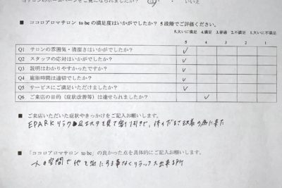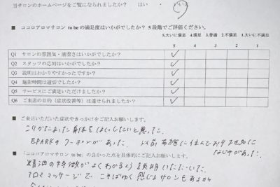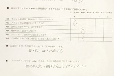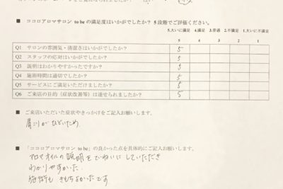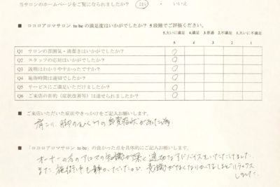 お客様の声 ~主訴:肩こり、脚のむくみ~ 大阪市城東区