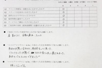お客様の声 ~主訴:肩・首のコリ、全身の疲れ、ストレス~
